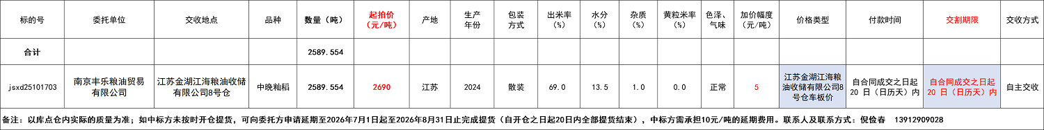 ②中标方应自合同成交之日起20日内完成提货,如未按时开仓提货,可向委托方申请延期至2026年7月1日起至2026年8月31日止完成提货(自开仓之日起20日内全部提货结束),中标方需承担10元/吨的延期费用。