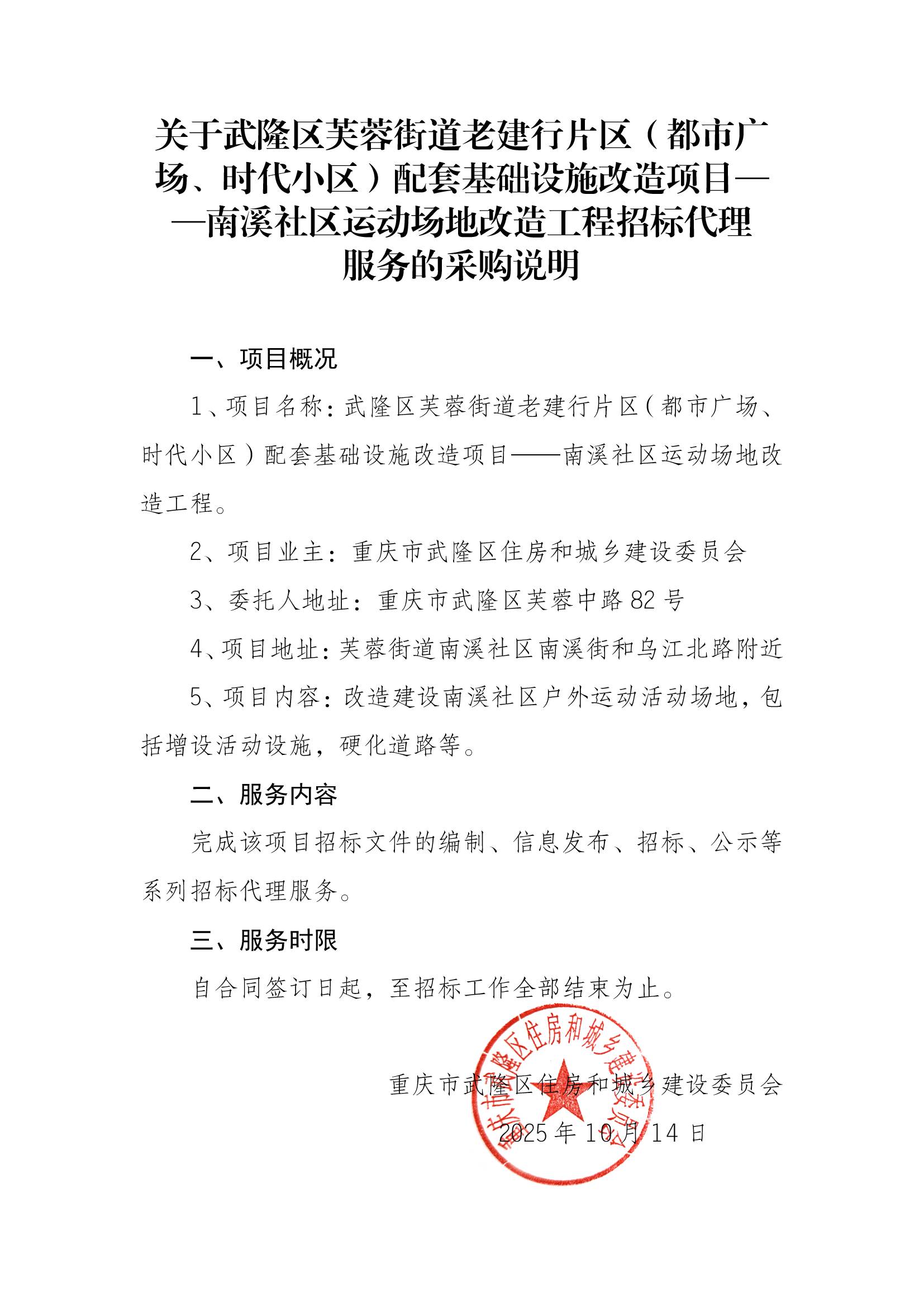 关于为【武隆区芙蓉街道老建行片区(都市广场、时代小区)配套基础设施改造项目——南溪社区运动场地改造工程】 公开选取【工程招标代理】机构的公告