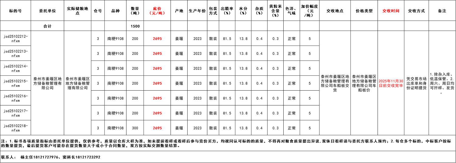 中标方成交后将货款汇至交易市场账户(与保证金账户一致)并申请出库单,凭市场出库单和身份证明到卖方指定库点提货,交割完成后买卖双方凭双方确认单到交易市场退保证金(保证金不冲抵货款,待合同履约结束后统一释放)。交割期为2025年11月30日前交收完毕。1、除杂入库、低温保管。2、周六、周日均可扦样、发货,双休日看样请与委托方联系人预约。3、每仓多个标的,中标客户按标的数量提货,最后提货客户可能存在提货数量大于或小于合同数量,双方按实际交割数量结算。