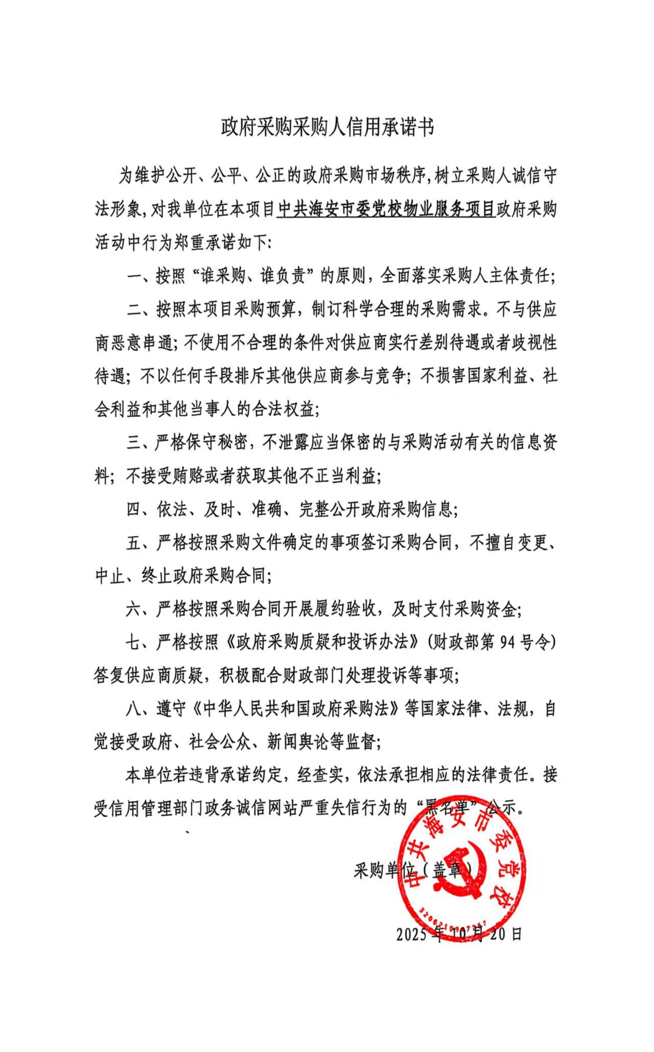 项目名称:中共海安市委党校物业服务项目