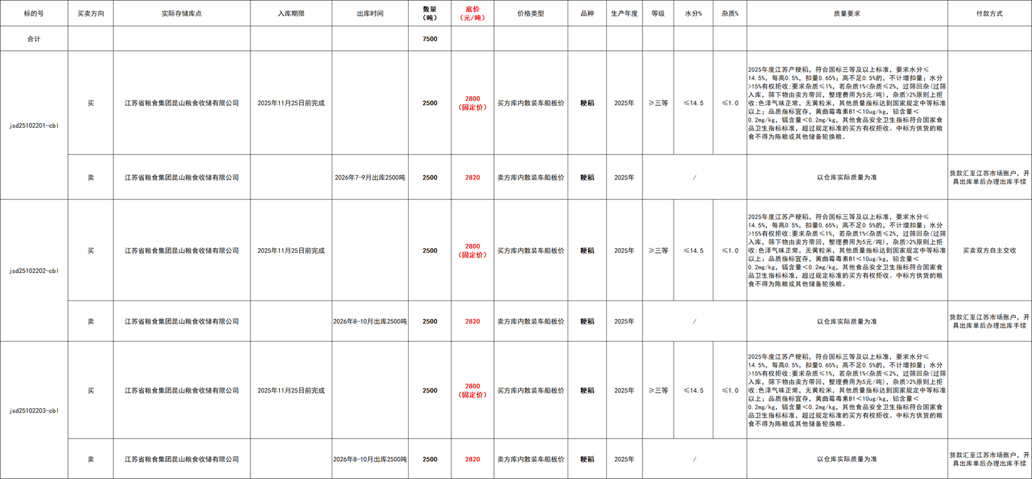 2025年江苏产粳稻7500吨,共3个标段。(详见交易清单)